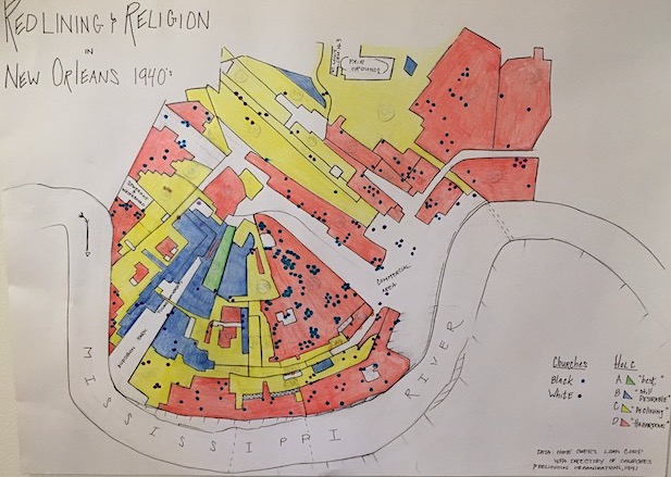 As part of the class, we were encouraged to draw visualizations by hand, which allowed us to engage with data in different ways. Indeed, drawing a map of New Orleans was time consuming, but it changed how I understood the city in which I grew up. The meaning behind the contours of the city became pronounced, hard lines between neighborhoods became more apparent. The so-called “worst,” “roughest,” most “hazardous” areas—to use language from the HOLC—like the Irish Channel, the Seventh Ward, and Central City are located along flood zones next to or near the Mississippi River. Sadly, these areas are still prone to flooding as Hurricanes like Katrina and Rita made abundantly clear. The population of poor, mostly black, people in these areas were (and are) not only vulnerable to natural disaster, but also to systematic discrimination based on that vulnerability.