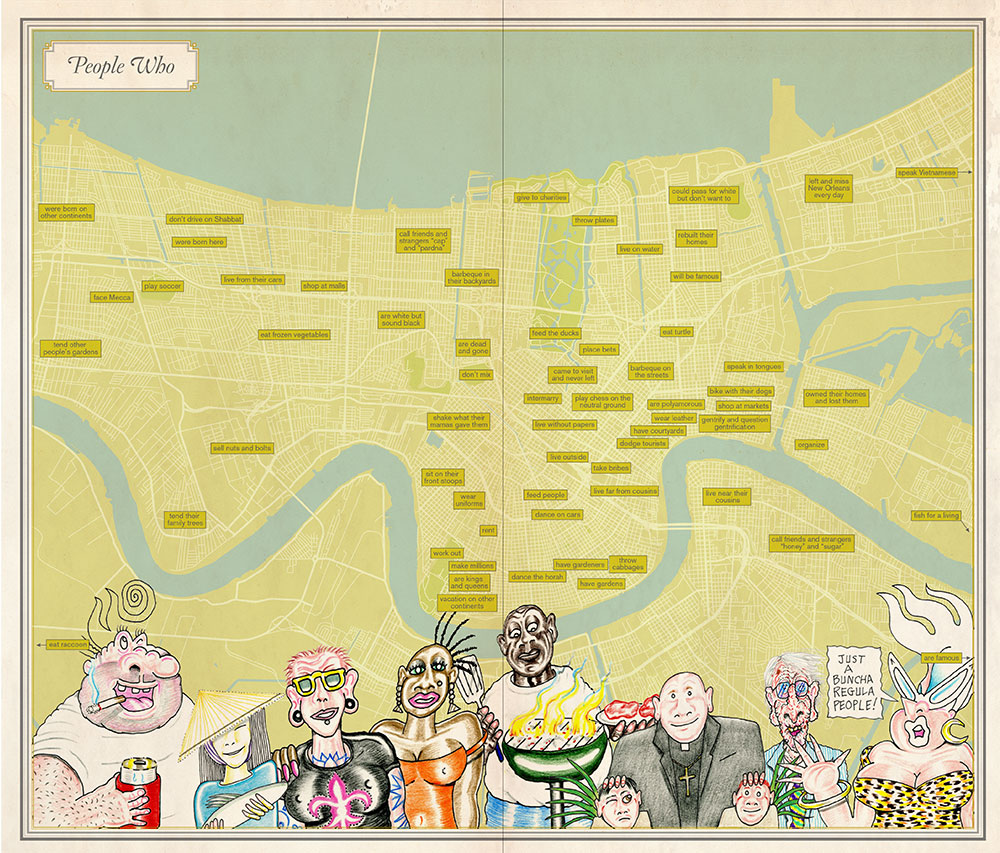 My inspiration for my maps comes from Rebecca Solnit and Rebecca Snedeker’s Unfathomable City: A New Orleans Atlas (2013), a book I recently pickup up at Octavia Books, an independent bookstore in uptown New Orleans. The book features 22 maps accompanied by essays written by “geographers, scholars of sugar and bananas, the city’s remarkable musicians, prison activists, environmentalists, Arab and Native voices, and local experts, as well as the coauthors’ compelling contributions.” The maps and essays included are inventive and often present the nuances and contradictions of New Orleans, a city both culturally rich and mired by crime, corruption, and environmental tragedies, including Hurricane Katrina and the BP oil spill.