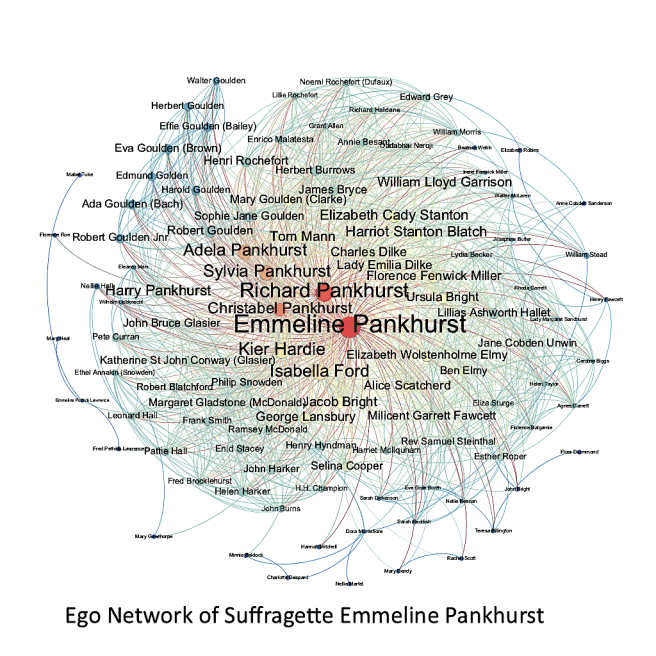 This Gephi visualization is based on relational data on the British suffrage movement and, in particular, focuses on the network of suffragette Emmeline Pankhurst (née Goulden, 1858-1928). Born to activist parents, Pankhurst used political agitation and militancy to advance the vote to all women in the UK. Her home (an interesting parallel to contemporary, online social networks) was a center of political activism that, according to Pankhurst herself, hosted “socialists, Fabians, anarchist, suffragists, free thinkers, radicals, and humanitarians of all schools.” University of Manchester sociologist Gemma Edwards compiled the dataset I used in my visualization. Edwards collected data on Pankhurst—as well as other suffrage events, militant acts, co-visitations, and co-attendances—from a historical archive of letters, speeches, newspaper articles, and autobiographies. Edwards then used Pajek (an early visualization tool) to create visualizations for a series of academic articles on secrecy-efficiency and tactical militancy in the suffragette movement. In these articles, Edwards and her coauthors argue that the suffragette network eventually becomes less dense and more decentered as the movement, according to Edwards, developed a need for covertness, militancy, and secrecy over time. Edwards’ position, and that of her co-authors, is convincing though not unproblematic. High levels of contact and interconnectedness are undeniably responsible for establishing the movement’s internal solidarity.