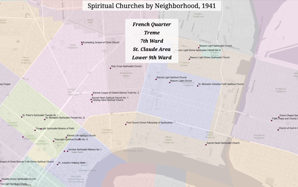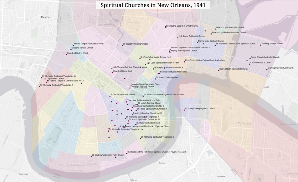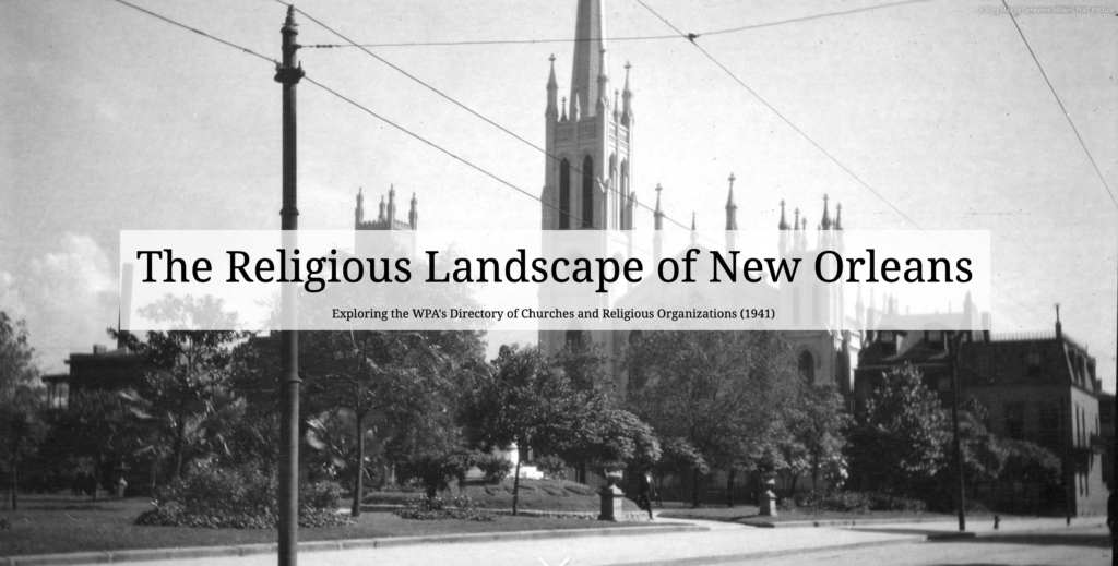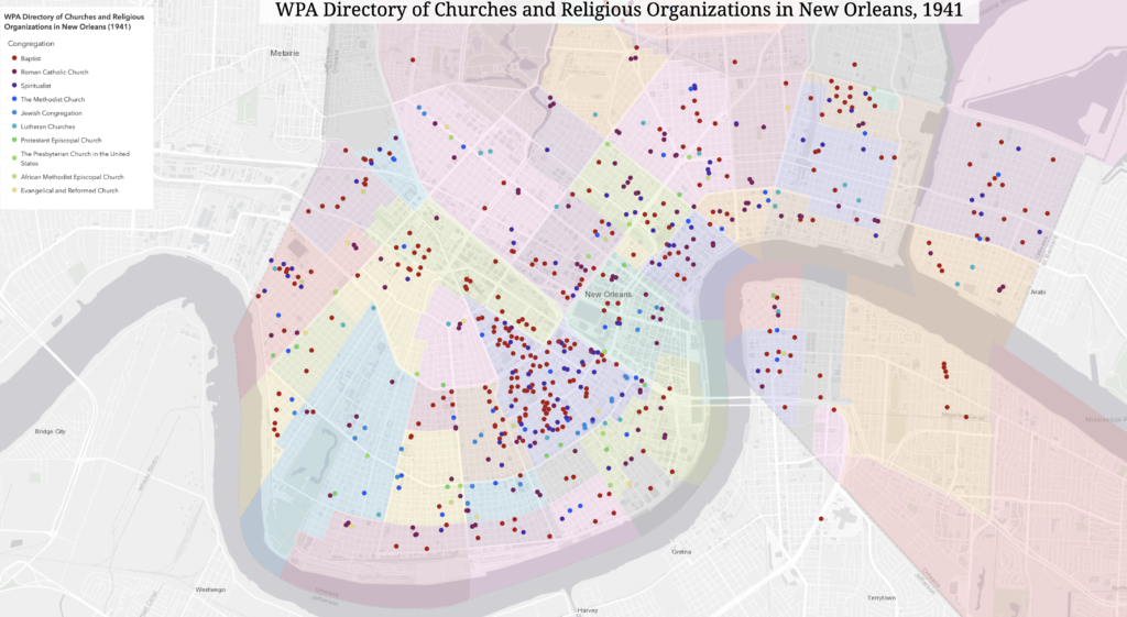Religion has played a prominent role in New Orleans life and culture since its French and Spanish colonial beginnings. Today, the city is home to a wide array of religious denominations including Catholicism, Judaism, and various forms of Protestantism. Each of these groups has a rich and interesting history. These histories, in turn, are interwoven with each other across the spaces and places of the city. One way to understand this complex tapestry is to focus on a particular moment in time. Fortunately, this is possible. During the New Deal Era, the WPA created a directory of the city which contained the names and locations of nearly 800 religious institutions. The WPA archivists working on this project gathered information from a wide range of sources, including official denominational directories, official minutes of conferences and conventions, annuals, journals, pamphlets, city directories, telephone directories, lists of non-taxable property, conveyance records, mortgage records, charters, newspapers, land-use maps, and personal interviews. The information provided in this resource is detailed enough to enable the creation of a large dataset and this dataset is translatable to a fairly detailed Story Map that highlight the religious landscape of New Orleans in 1941. These maps, in turn, makes it possible to localize the various denominations present in the city during the Great Depression. Such localizations are valuable for understanding the parts of the city associated with certain groups. This information can help shed light on social, economic, and racial configurations in the city.